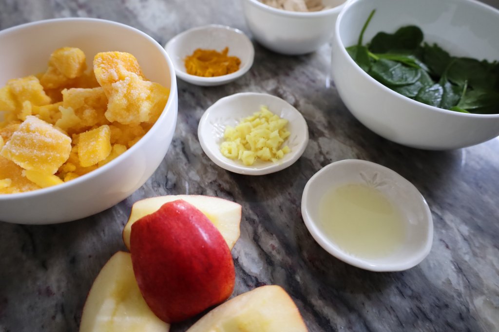 Fruit: Along with boosting the sweetness of the smoothie, the apple (including the peel) and mango provide important nutrients like fibre, vitamins, minerals, and antioxidants.